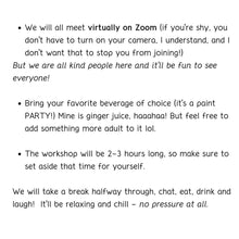 All you have to bring is a cup of water that you can use to clean your brush in between colors, a beverage (or two or three) of your choice and your laugh and creativity!
