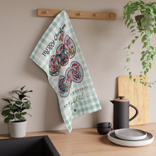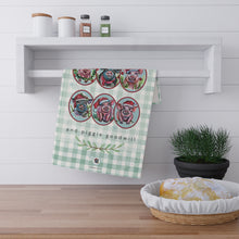 Merry Christmas and piggie goodwill Christmas tea towel with 6 little watercolor pigs.