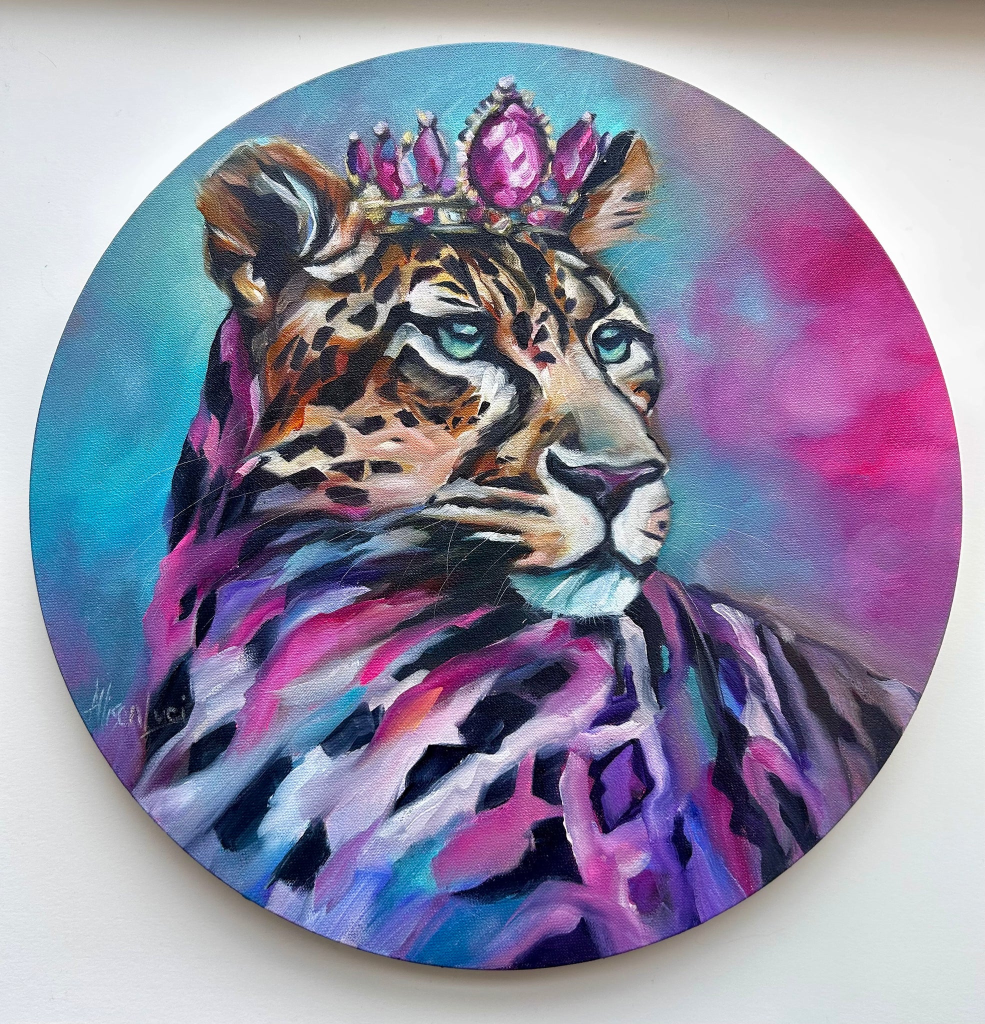 "Glo” is a vibrant leopard painted in luminous pinks, purples, and blues, crowned in sparkling jewels and gems. Drawing inspiration from my grandmother Gloria—who adored leopard print—this piece is a celebration of strength, glamour, and wild feminine spirit.